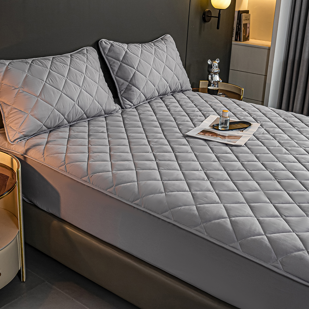 SOGA 2X Grey 153cm Wide Cross-Hatch Mattress Cover Thick Quilted Stretchable Bed Spread Sheet Protector with Pillow Covers
